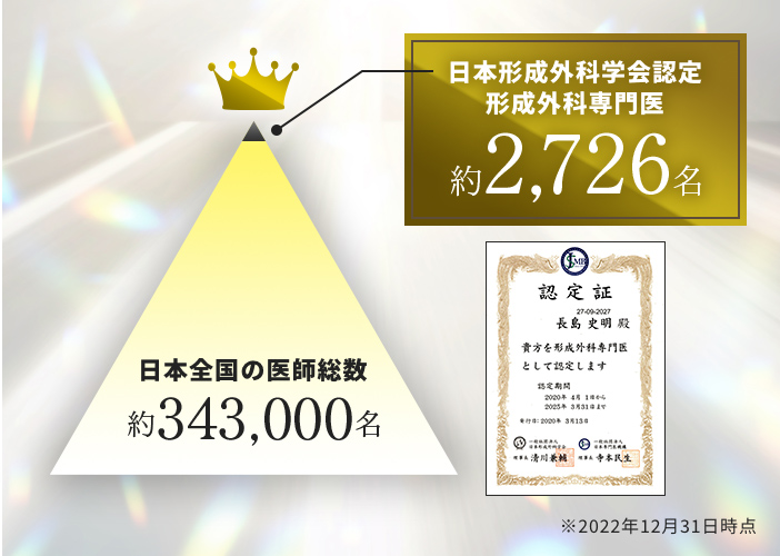 日本形成外科学会認定の形成外科専門医は、約5,300人の会員数を誇る学会の中でも、厳しい研修と試験を経て認定される希少な存在です。専門医取得には、6年以上の医師経験、4年以上の形成外科研修、300症例以上の手術経験などが求められます。このように専門医は、患者さんに高度で専門的な医療サービスを提供するための確かな技術と知識を備えています。