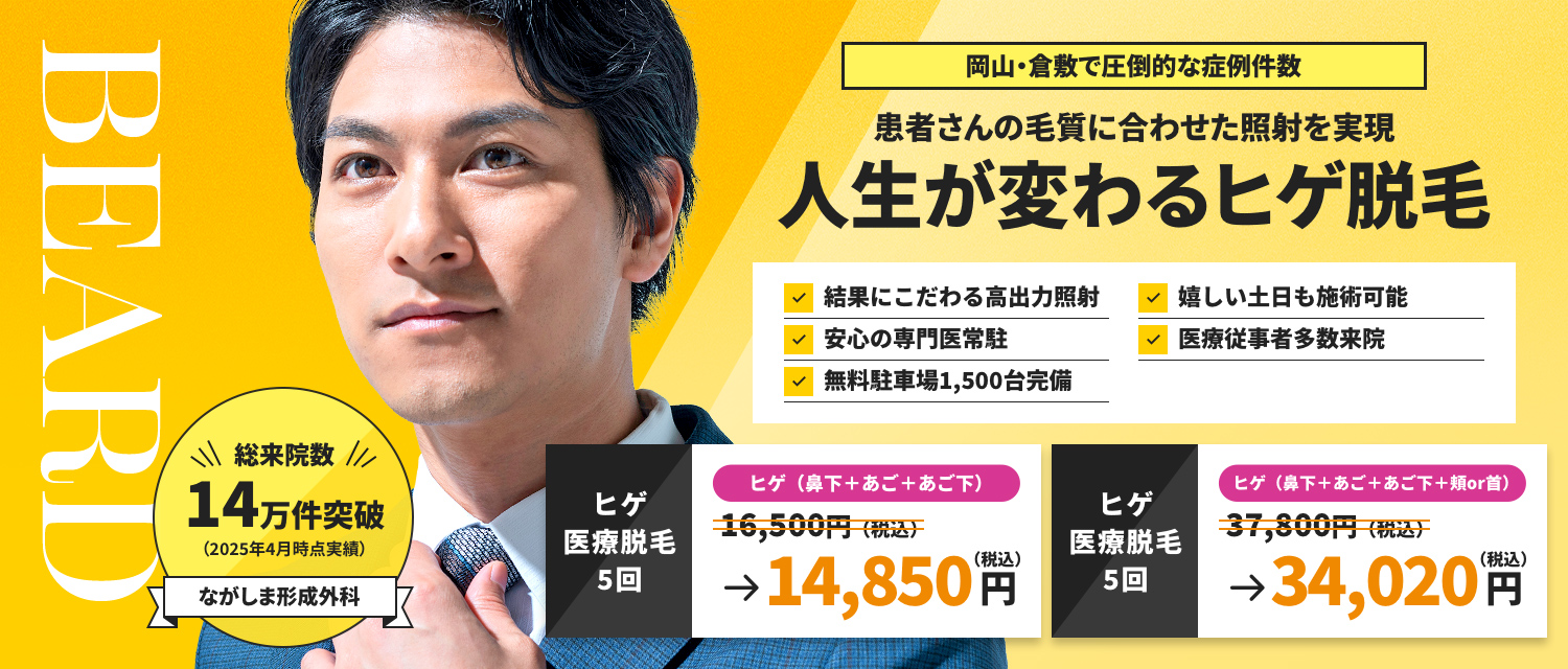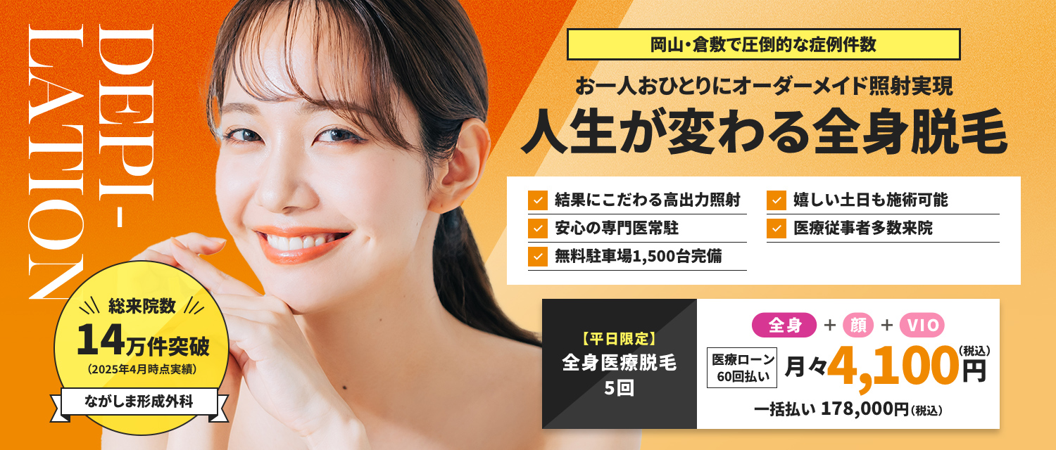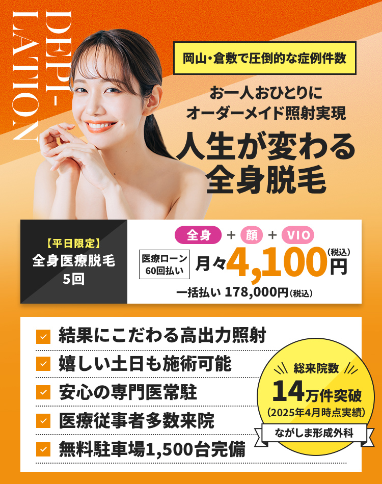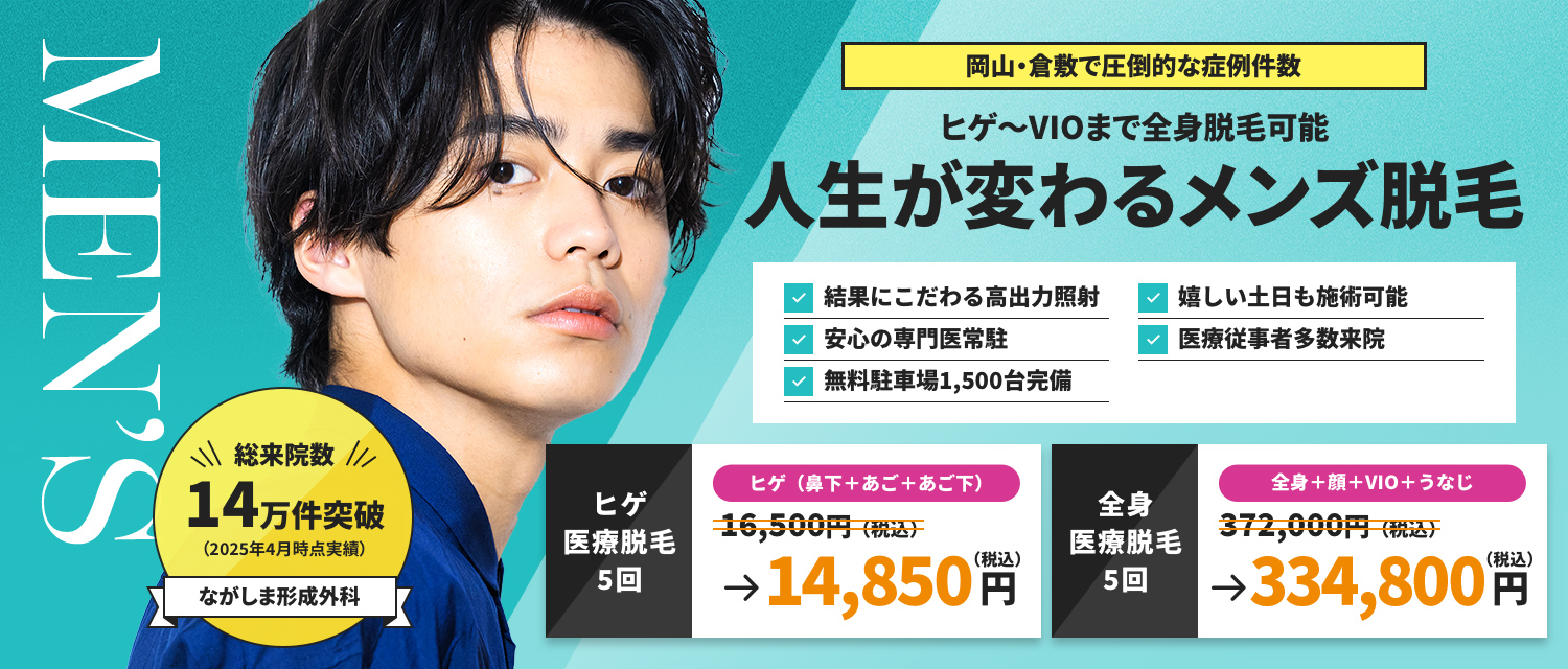 はじめまして。岡山県倉敷市のながしま形成外科クリニックで院長をしております、長島です。当クリニックでは、医学的根拠に基づき、高品質な医療脱毛をご提供しております。日本形成外科学会専門医・医学博士として、常に先進技術と知識を取り入れ、安全で効果的な治療を行うことを使命としています。厚生労働省に認可された脱毛機器を導入し、肌質や毛質に合わせた適切な施術を行うことで、患者さんに安心していただける環境を整えています。