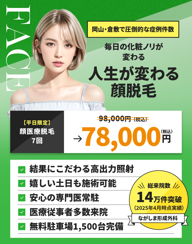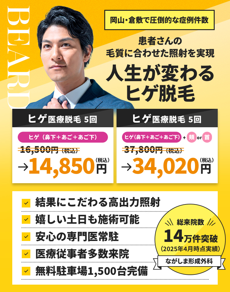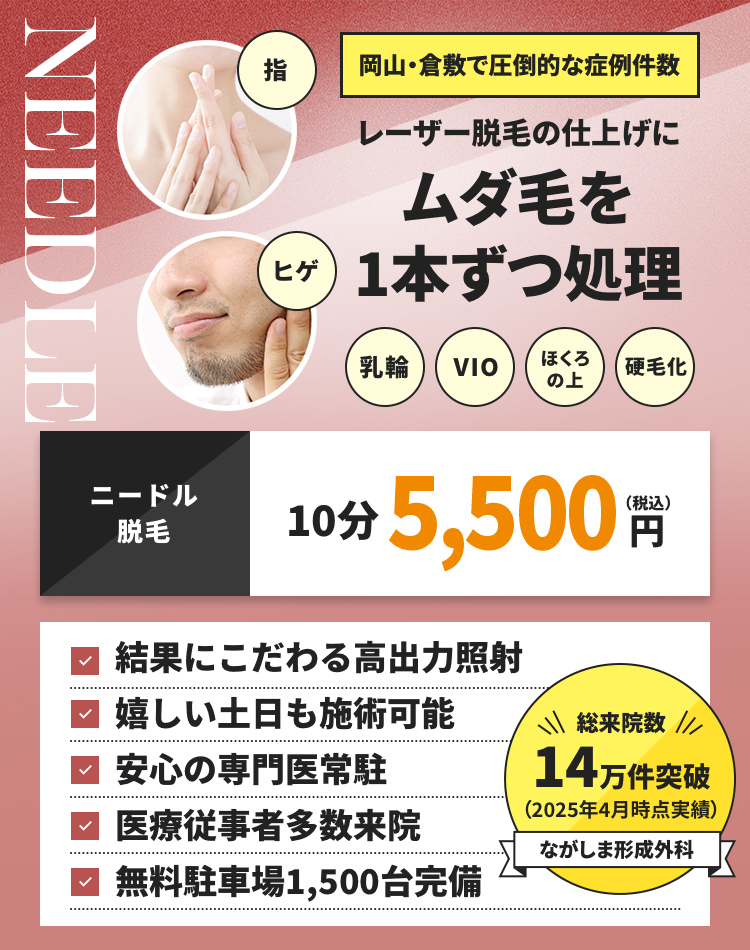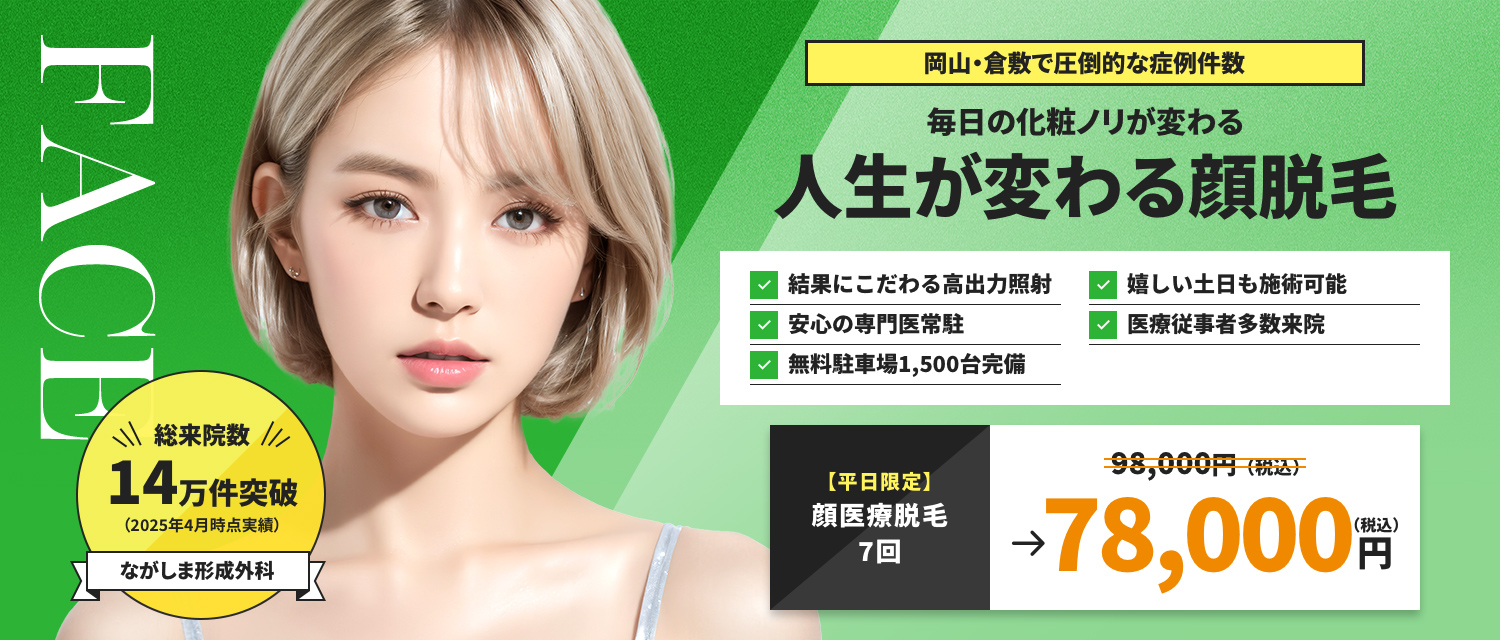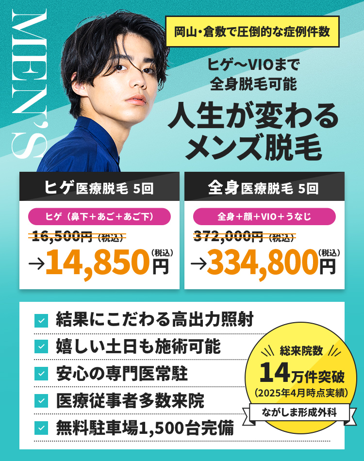 はじめまして。岡山県倉敷市のながしま形成外科クリニックで院長をしております、長島です。当クリニックでは、医学的根拠に基づき、高品質な医療脱毛をご提供しております。日本形成外科学会専門医・医学博士として、常に先進技術と知識を取り入れ、安全で効果的な治療を行うことを使命としています。厚生労働省に認可された脱毛機器を導入し、肌質や毛質に合わせた適切な施術を行うことで、患者さんに安心していただける環境を整えています。
