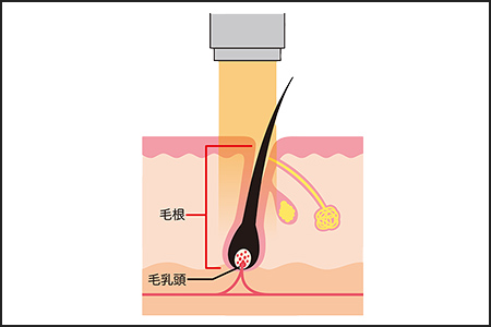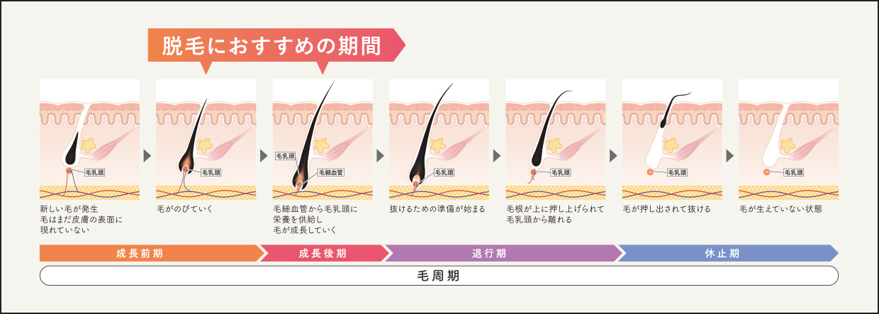 成長期の毛はメラニンをたっぷり含んでおり、医療脱毛のレーザーに反応しやすくなっています。また、毛根がしっかり発毛組織とつながっているため、レーザーの熱エネルギーが効率よく伝わり、高い脱毛効果が得られるのです。休止期や退行期の毛に照射しても脱毛効果は得にくいので、成長期に合わせて照射することが必要です。