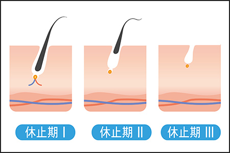 発毛組織が休んでいる時期です。この時期に毛が産生されることはありません。毛包内に毛が残っていることもありますが、成長はしないまま残ります。