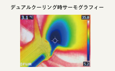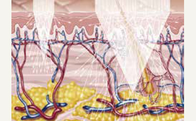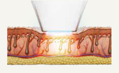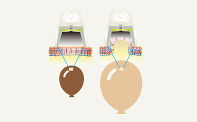 皮膚を吸引して伸ばすことで毛のメラニンに効率的にレーザーを吸収させることができます。その結果、肌に当たるエネルギーを抑えることができ、痛みの軽減につながります。