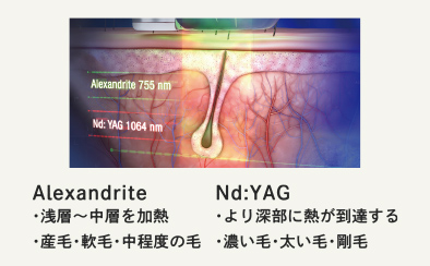 異なる波長のレーザーを最適に組み合わせることで、産毛や太い毛、日焼け肌でも脱毛が可能。より多くの患者さんに適した、安全で効果的な脱毛を実現します。