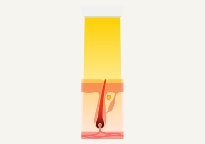 吸収されたレーザーは熱エネルギーとして毛根全体に広がります。熱エネルギーは、毛そのものだけでなく、発毛に関わる組織にも広がっていきます。