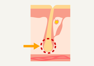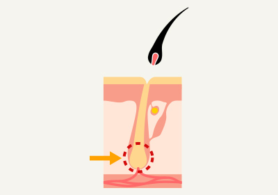 バルジ領域で作り出された毛包幹細胞は、毛乳頭のシグナルによって増殖・分化する性質を持ちます。仮にバルジ領域が正常に働いたとしても、この毛乳頭が破壊されれば、毛の大本となる細胞(毛包幹細胞)が増殖・分化できない状態になります。また、毛包幹細胞が変化した毛母細胞も、毛乳頭から栄養をもらって成長する性質があり、毛乳頭が破壊されると毛が成長できなくなるのです。医療脱毛のもう一つの照射方法である「熱破壊式」は、この毛乳頭にアプローチすることで、毛の成長を抑制します。