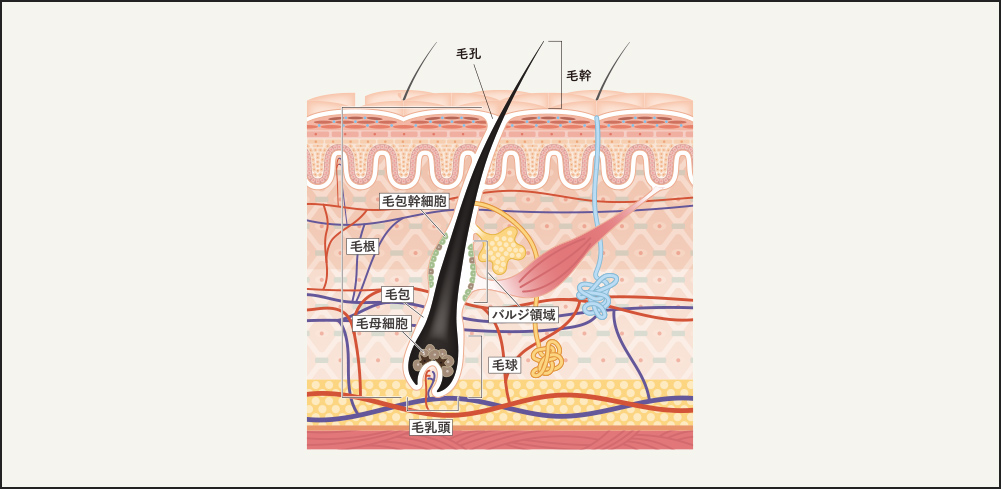 毛の再生にはバルジ領域から作り出される毛包幹細胞や、毛乳頭と関連する毛母細胞が関係しています。毛の成長には周期があり、成長するタイミングで毛乳頭からシグナルが出されて、毛包幹細胞が増殖・分化します。その後、増殖・分化した毛包幹細胞は毛母細胞に変化し、毛へと成長していきます。