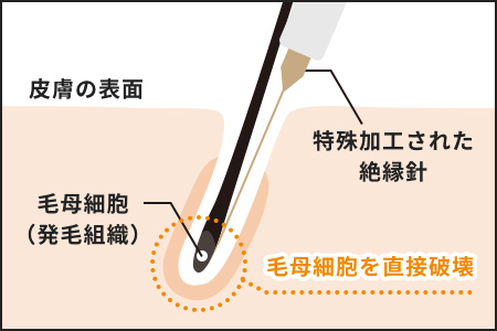ニードル脱毛(針脱毛)は、毛穴の一つひとつに極細の専用針を挿入し、毛の成長にかかわる組織を電気の熱によってダメージを与える方法です。