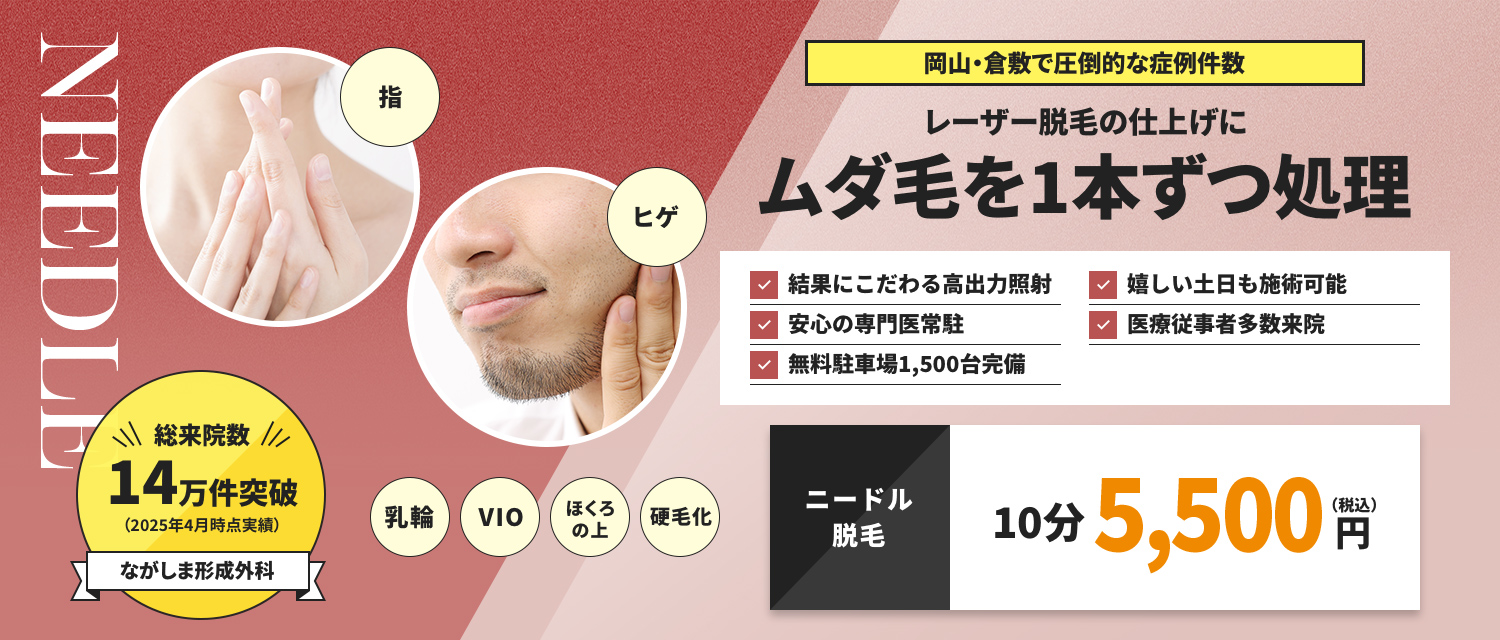 医療機関のみ使用することができる絶縁針を用いて、白髪、ヒゲ、手足の指なども1本1本処理します。当院では、形成外科専門医のもと丁寧かつ、安全な針脱毛をご提供いたします。